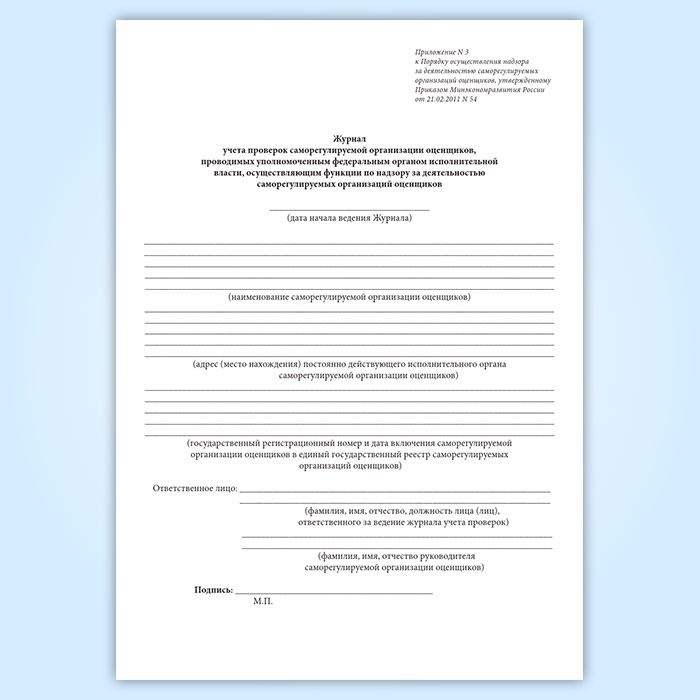 Форма журнала соответствует Приложению 3 к "Порядку осуществления надзора за деятельностью саморегулируемых организаций оценщиков, утвержденному приказом Минэкономразвития России от 21.02.2011 N 54", который утратил силу.