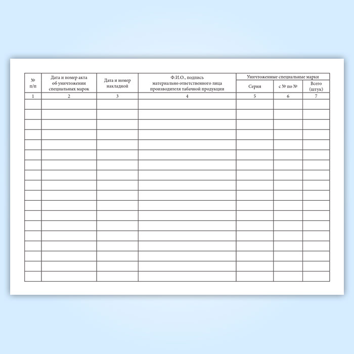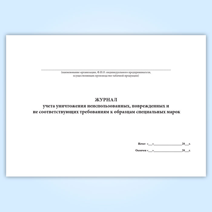 Для учета уничтожения неиспользованных, поврежденных и не соответствующих требованиям к образцам специальных марок используют журнал, в котором отражается серия уничтоженных марок и Ф.И.О., подпись материально ответственного лица производителя табачной продукции.