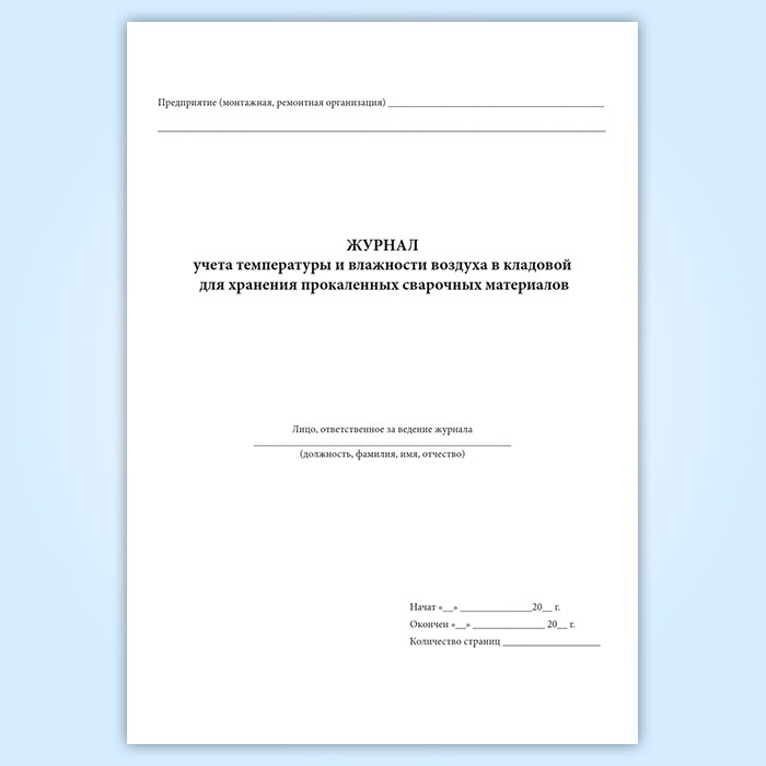 Форма журнала учета температуры и влажности воздуха в кладовой для хранения прокаленных сварочных материалов соответствует Приложению Е к РД 34.10.124-94. Инструкция по подготовке и хранению сварочных материалов.