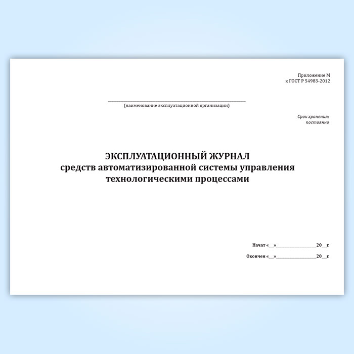 Форма эксплуатационного журнала средств автоматизированной системы управления технологическими процессами соответствует Приложению М к ГОСТ Р 54983-2012 Системы газораспределительные. Сети газораспределения природного газа. Общие требования к эксплуатации. Эксплуатационная документация