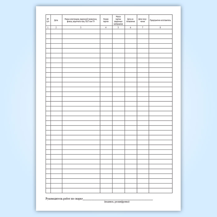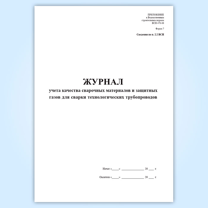 Форма журнала учета качества сварочных материалов и защитных газов для сварки технологических трубопроводов соответствует Приложению № 6 к ВСН 478-86. Производственная документация по монтажу технологического оборудования и технологических трубопроводов.