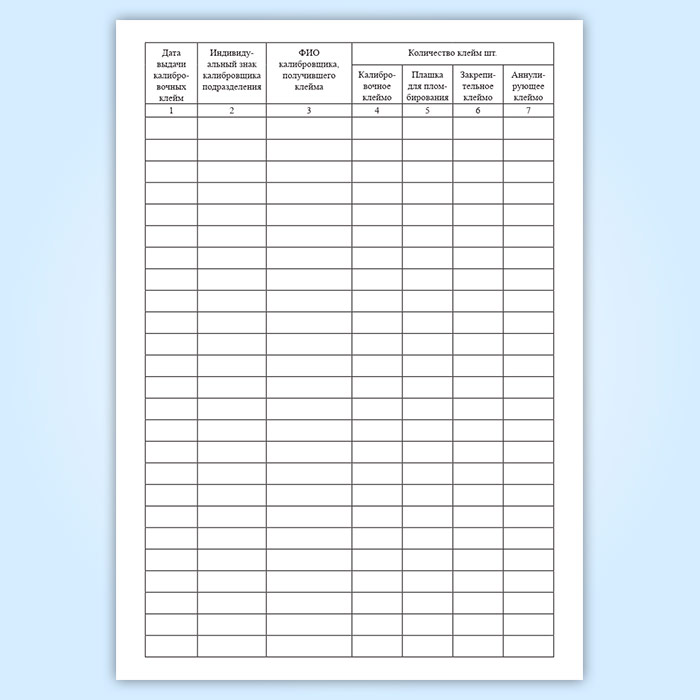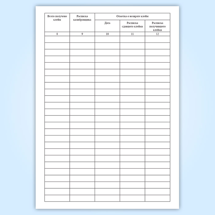 Журнал выдачи и получения калибровочных клейм имеет графы: