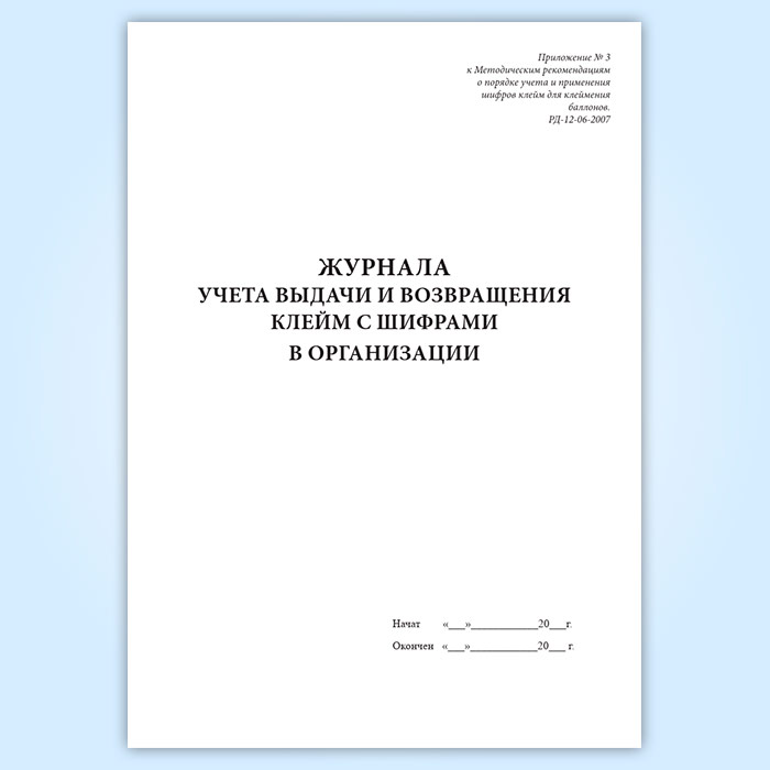 Форма журнала учета выдачи и возвращения клейм с шифрами в организации соответствует Приложению 3 к Приказу Ростехнадзора №162 "Об утверждении и введении в действие Методических рекомендаций о порядке учета и применения шифров клейм для клеймения баллонов" от 16.03.2007 года.