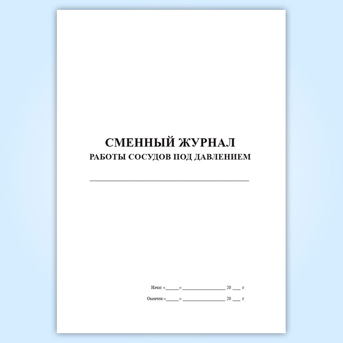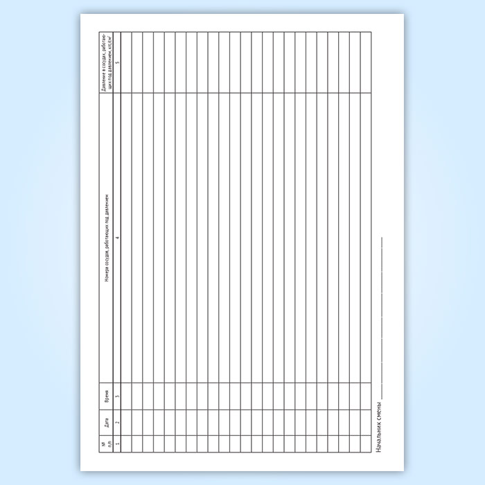 Форма сменного журнала работы сосудов под давлением соответствует ПОТ РО-14000-002-98. Положение. Обеспечение безопасности производственного оборудования" (утв. Минэкономики РФ 20.01.1998) (вместе с "Рекомендациями по приведению производственного оборудования в соответствие с требованиями стандартов ССБТ")