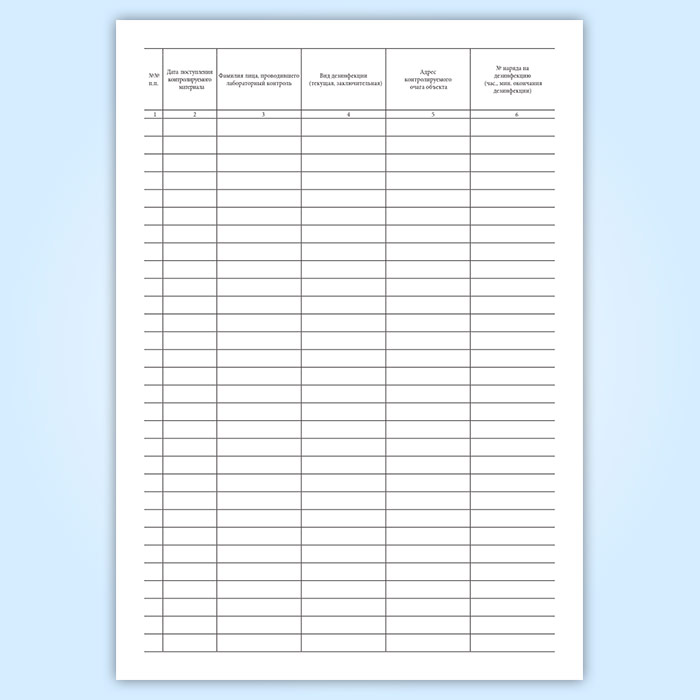 Форма журнала регистрации лабораторного контроля качества дезинфекции (359/у), утверждена Приказом Минздрава СССР №1030 «Об утверждении форм первичной медицинской документации учреждений здравоохранения» от 4 октября 1980 г.