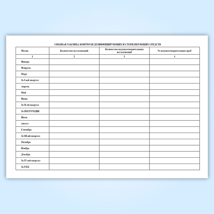 Сводная таблица контроля дезинфицирующих и стерилизующих средств. Графы: