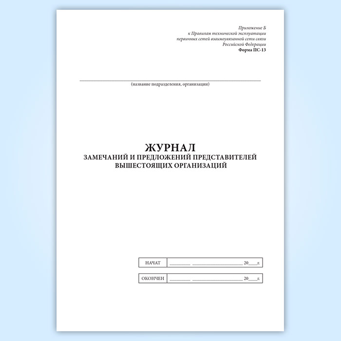 Форма журнала замечаний и предложений представителей вышестоящих организаций (ПС-13) соответствует Приложению Б к Приказу Госкомсвязи России № 187 Правила технической эксплуатации первичных сетей взаимоувязанной сети связи Российской Федерации от 19.10.1998 года.