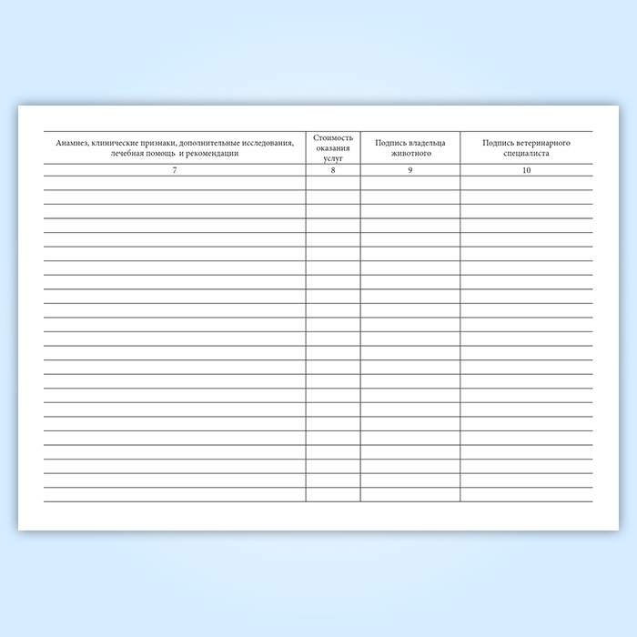 В нем регистрируют основные сведения о владельце, животном, поставленном диагнозе, проведенных исследованиях и оказанной лечебной помощи.