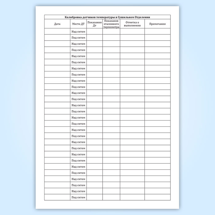 Журнал калибровки датчиков температуры в сушильном отделении имеет графы: