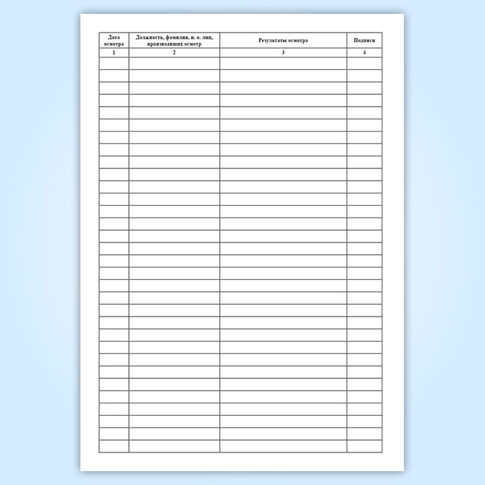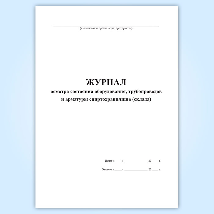 Форма журнала осмотра состояния оборудования трубопроводов и арматуры спиртохранилища (склада) соответствует Приложению 22 к Инструкции по приемке, хранению, отпуску, транспортированию и учету этилового спирта.