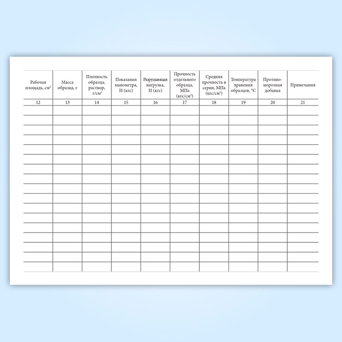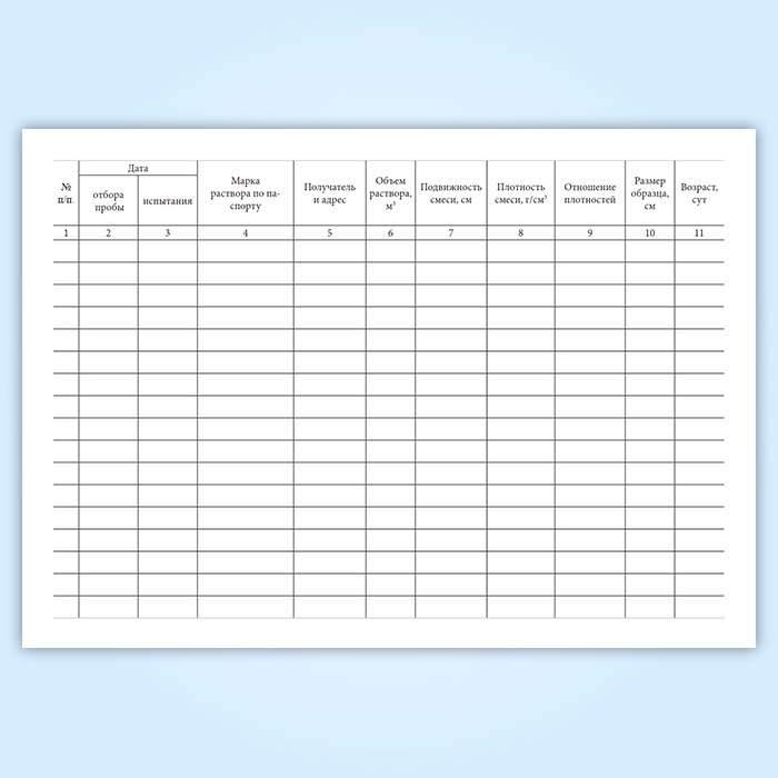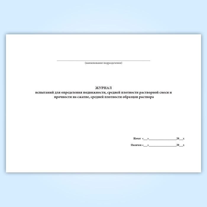 Форма журнала испытаний для определения подвижности, средней плотности растворной смеси и прочности на сжатие, средней плотности образцов раствора соответствует Приложению 2, утвержденному и введенному в действие Постановлением Госстроя СССР № 214 " ГОСТ 5802-86. Межгосударственный стандарт. Растворы строительные. Методы испытаний" от 11.12.1985 года.