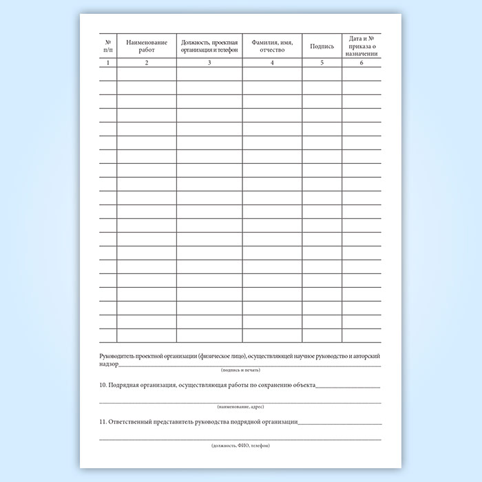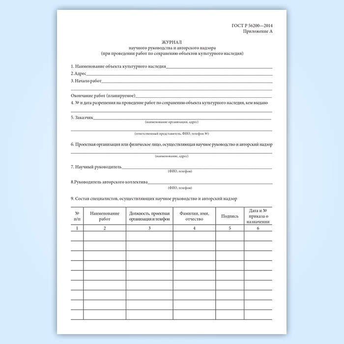 Форма журнала научного руководства и авторского надзора при проведении работ по сохранению объектов культурного наследия сответствует Приложению А к ГОСТ Р 56200-2014. Научное руководство и авторский надзор при проведении работ по сохранению объектов культурного наследия. Основные положения.