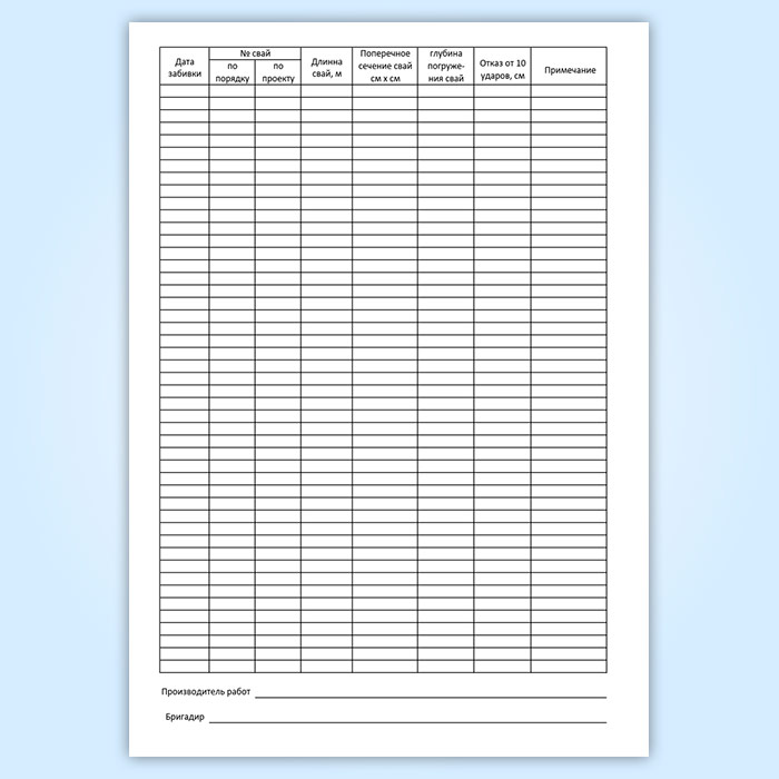 Журнал забивки свай - рабочий документ, фиксирующий условия и ход забивки свай, а также величину погружения сваи в грунт от каждого залога.
