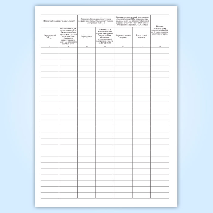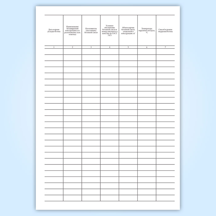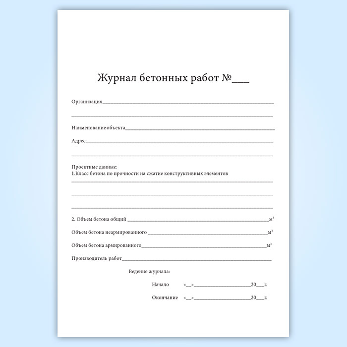 Журнал бетонных работ ведется для каждого объекта строительства. В нем должно быть зафиксировано наименование бетонируемой части сооружения и конструктивных элементов, марка бетона и накладной, по которой бетон поступил с завода-изготовителя, результаты испытаний контрольных образцов и другие сведения.