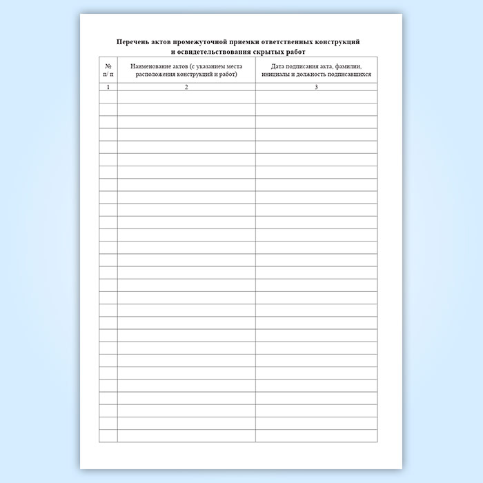 - Перечень актов промежуточной приемки ответственных конструкции и освидетельствования скрытых работ.