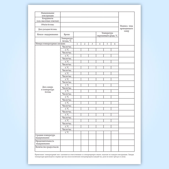 Примечание: температурный лист заполняется ответственным за электропрогрев лицом, отдельно на каждую конструкцию. Замеры температуры производить в первые три часа после включения электропрогрева каждый час, далее не менее трёх раз в смену.