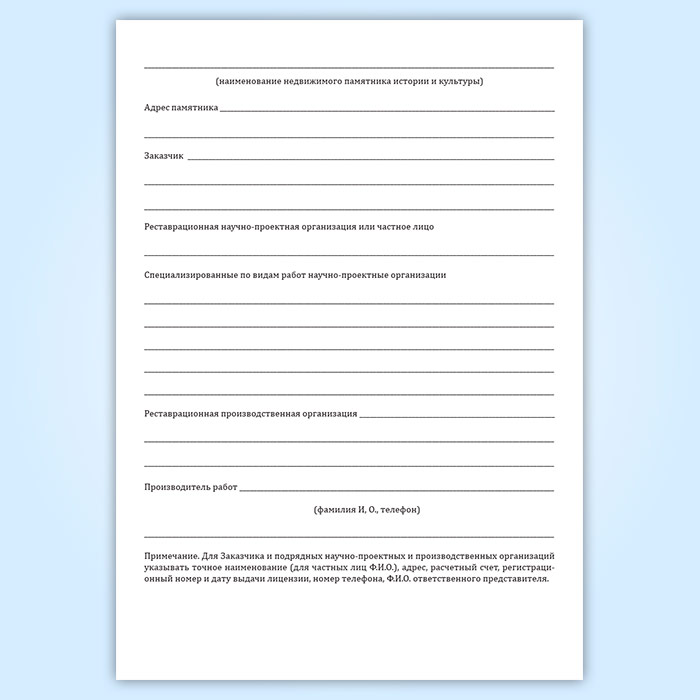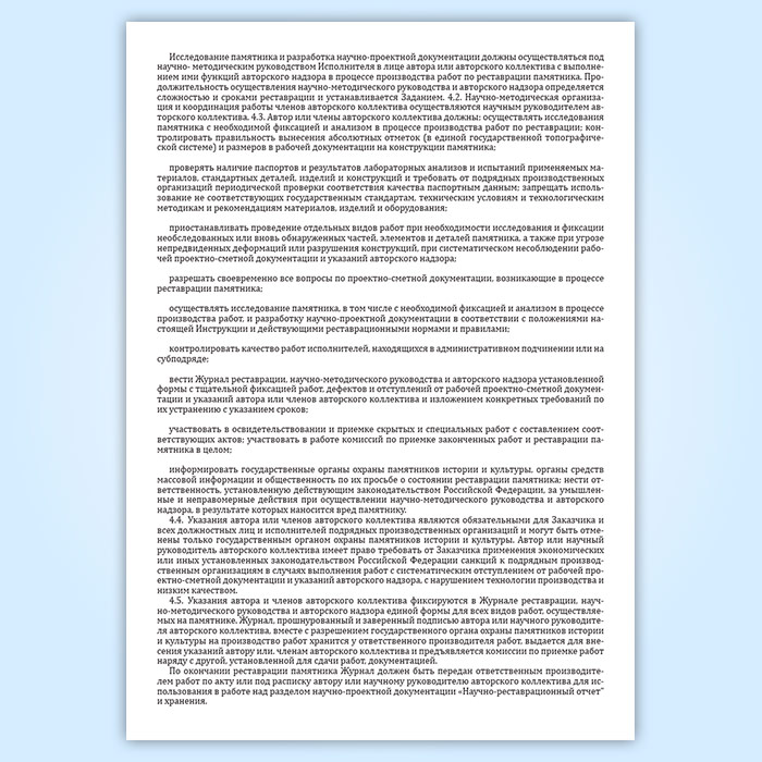 Исследование памятника и разработка научно-проектной документации должны осуществляться под научно- методическим руководством Исполнителя в лице автора или авторского коллектива с выполнением ими функций авторского надзора в процессе производства работ по реставрации памятника. Фиксация работ, дефектов и отступлений от рабочей проектно-сметной документации и указаний автора или членов авторского коллектива и изложением конкретных требований по их устранению с указанием сроков производится в журнале.