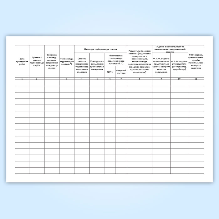 Журнал изоляционно-укладочных работ и ремонта изоляции (Форма 7.1) имеет графы:
