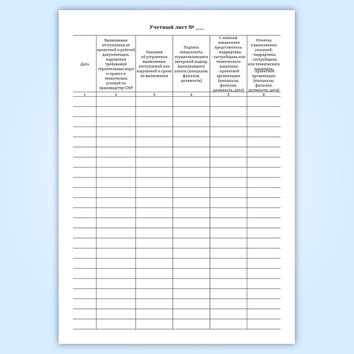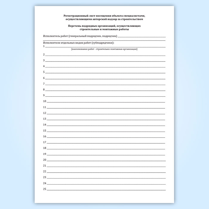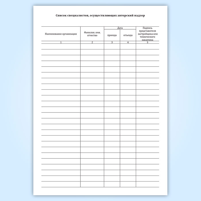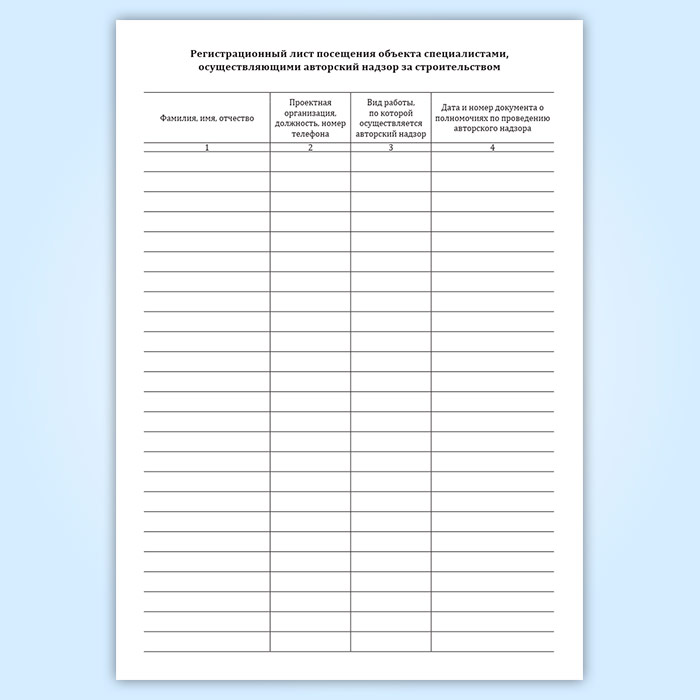Регистрационный лист посещения объекта специалистами, осуществляющими авторский надзор за строительством. Графы: