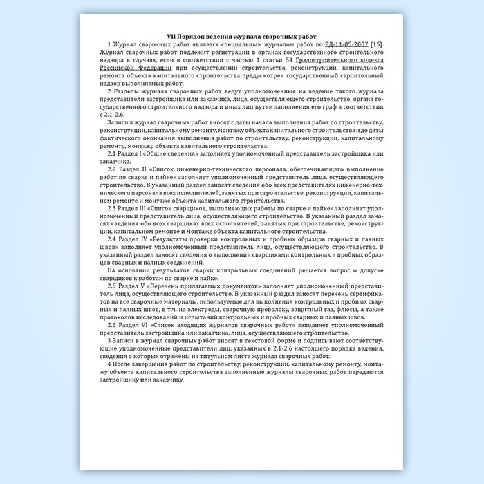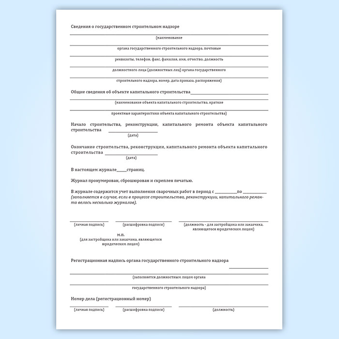Журнал сварочных работ состоит из общих сведений по строительству, реконструкции и капитальному ремонту объекта капитального строительства и сварщикам, привлекаемым к выполнению работ по сварке и пайке на этом объекте, а также входящих журналов сварочных работ № которые оформляют на каждый единичный узел объекта капитального строительства: здание, сооружение, коммуникацию, техническое изделие, блок, аппарат, трубопровод и т. п., сварочные работы по которому ведутся отдельно, с учетом его конструктивных особенностей и специфики процессов сварки и пайки.