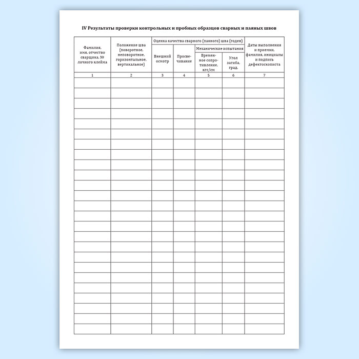 Раздел IV «Результаты проверки контрольных и пробных образцов сварных и паяных швов» заполняет уполномоченный представитель лица, осуществляющего строительство. В указанный раздел заносят сведения о выполнении сварщиками контрольных и пробных образцов сварных и паяных соединений.