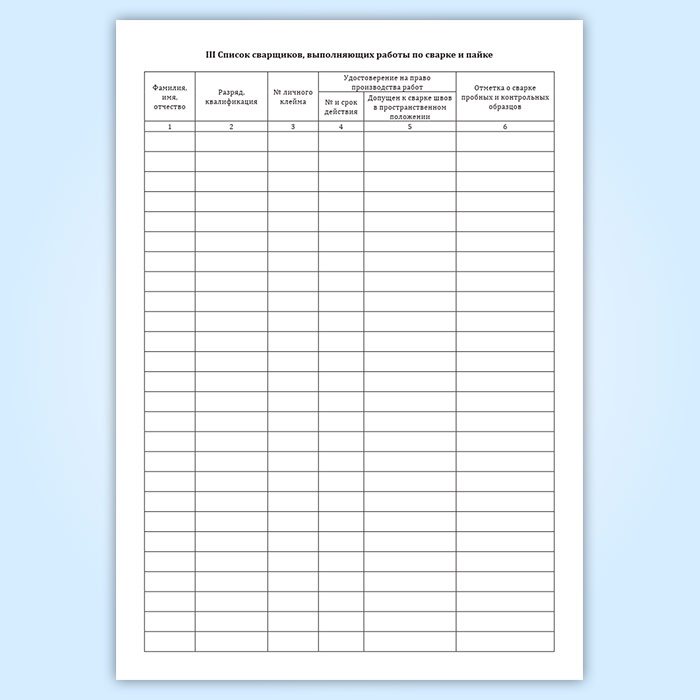 Раздел III «Список сварщиков, выполняющих работы по сварке и пайке» заполняет уполномоченный представитель лица, осуществляющего строительство. В указанный раздел заносят сведения обо всех сварщиках всех исполнителей, занятых при строительстве, реконструкции, капитальном ремонте и монтаже объекта капитального строительства.