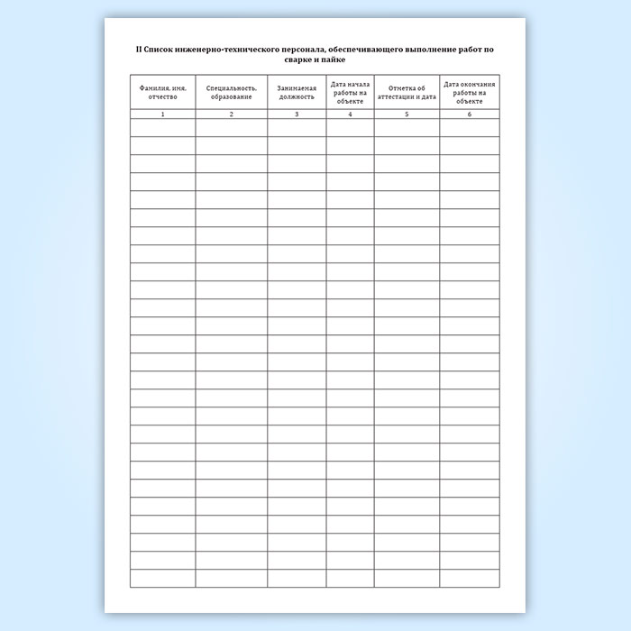 Раздел II «Список инженерно-технического персонала, обеспечивающего выполнение работ по сварке и пайке» заполняет уполномоченный представитель лица, осуществляющего строительство. В указанный раздел заносят сведения обо всех представителях инженерно-технического персонала всех исполнителей, занятых при строительстве, реконструкции, капитальном ремонте и монтаже объекта капитального строительства.
