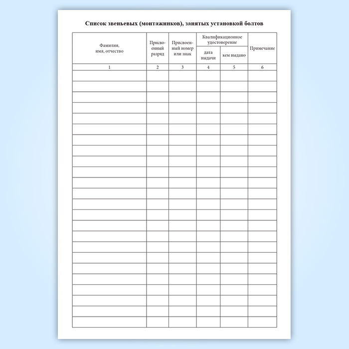 Список звеньевых (монтажников), занятых установкой болтов