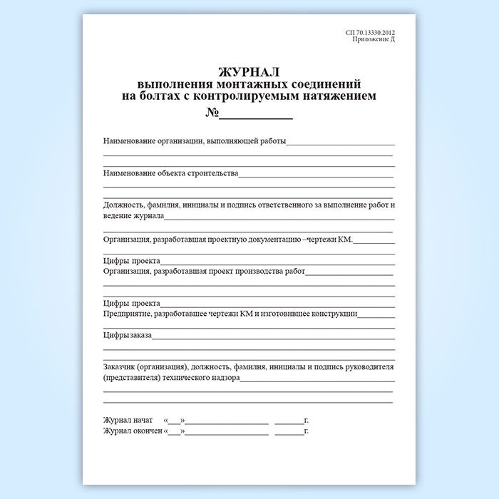 Форма журнала соответствует Приложению 5 к Строительным нормам и правилам: Несущие и ограждающие конструкции СНиП 3.03.01-87, а также Приложению Д к СП 70.13330.2012 Свод правил. Несущие и ограждающие конструкции.