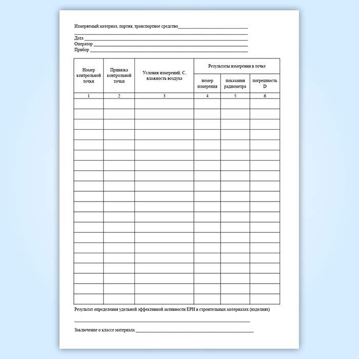 Форма журнала радиационного контроля строительных материалов (изделий) соответствует Приложению Б к ГОСТ 30108-94. Материалы и изделия строительные. Определение удельной эффективной активности естественных радионуклидов.