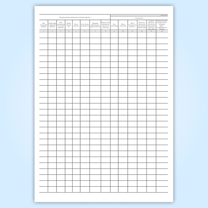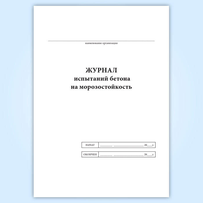 Форма журнала испытаний бетона на морозостойкость соответствует Приложению Г к ГОСТ 10060-2012 Бетоны. Методы определения морозостойкости