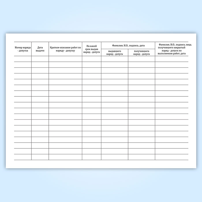 Для учета выдачи нарядов-допусков на производство работ с повышенной опасностью используют журнал, где указывают номер наряда-допуска и краткое описание работ по наряду.