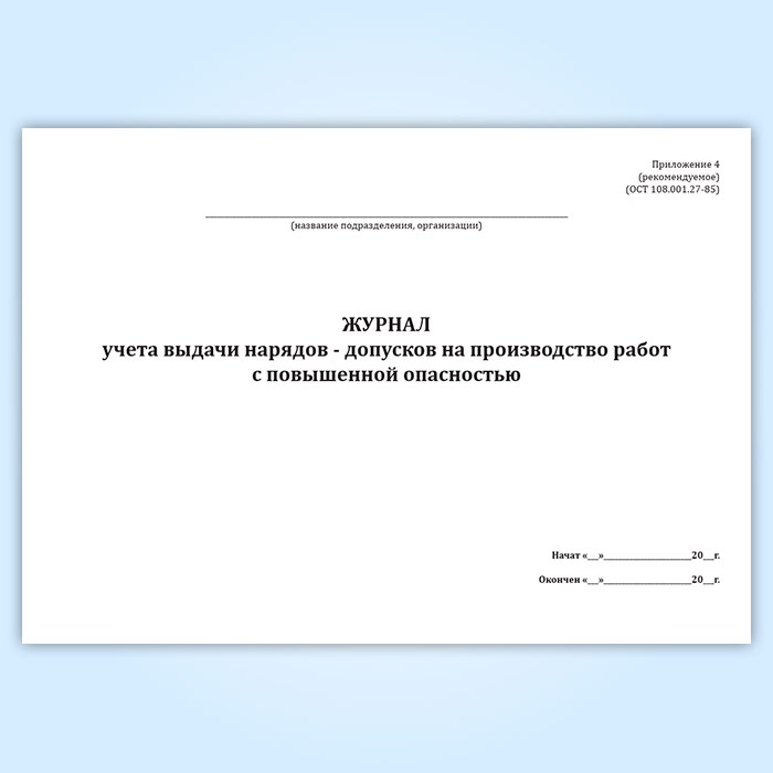 Журнал учета выдачи нарядов-допусков на производство работ с повышенной опасностью соответствует Приложению 4 к " Положению Работы с повышенной опасностью. Организация проведения. ПОТ РО 14000-005-98" .