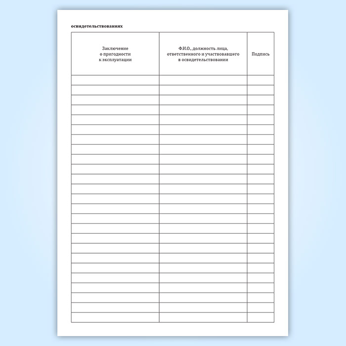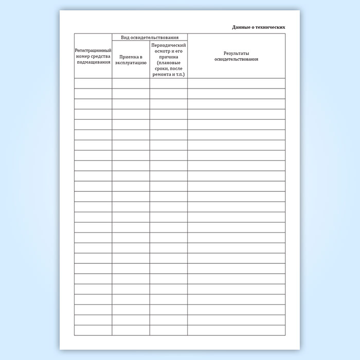 Данные о технических освидетельствованиях. Графы: