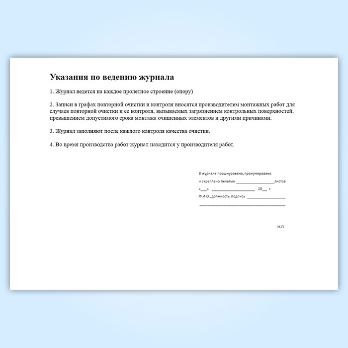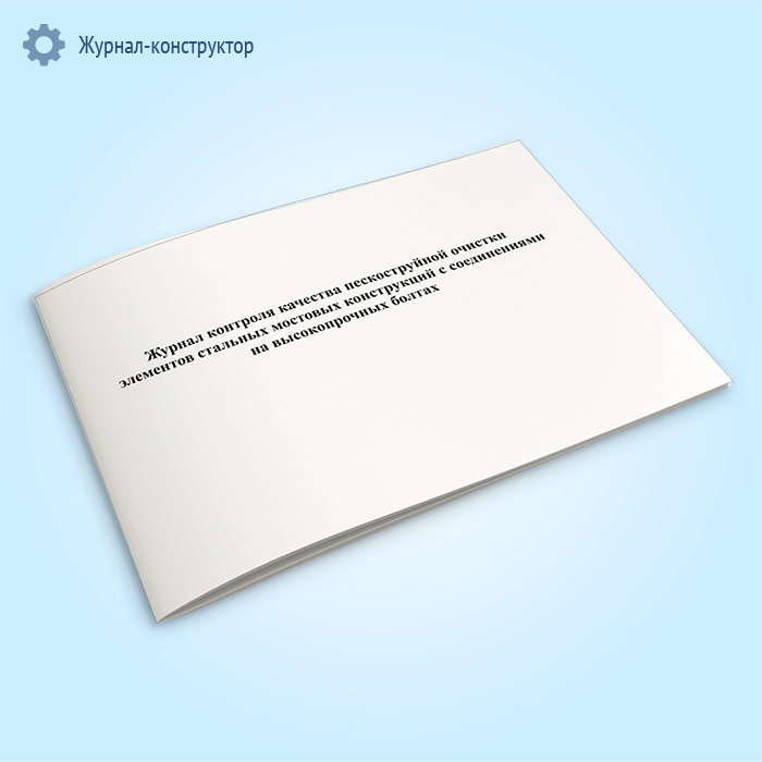 Форма журнала контроля качества пескоструйной очистки элементов стальных мостовых конструкций с соединениями на высокопрочных болтах соответвует ВСН 144-76 Инструкции по проектированию соединений на высокопрочных болтах в стальных конструкциях мостов (Утверждена распоряжением минтрансстроя и МПС от 8 октября 1976 г. № А-1407/П-30621).