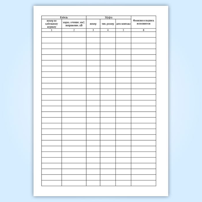 Журнал монтажа кабельных муфт напряжением до 1000 В