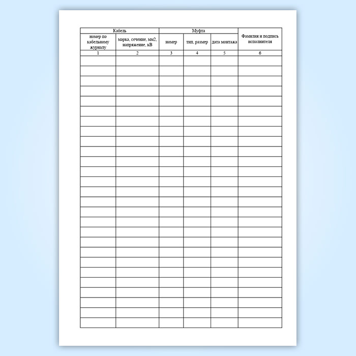 Журнал монтажа кабельных муфт напряжением до 1000 В имеет графы (столбцы):