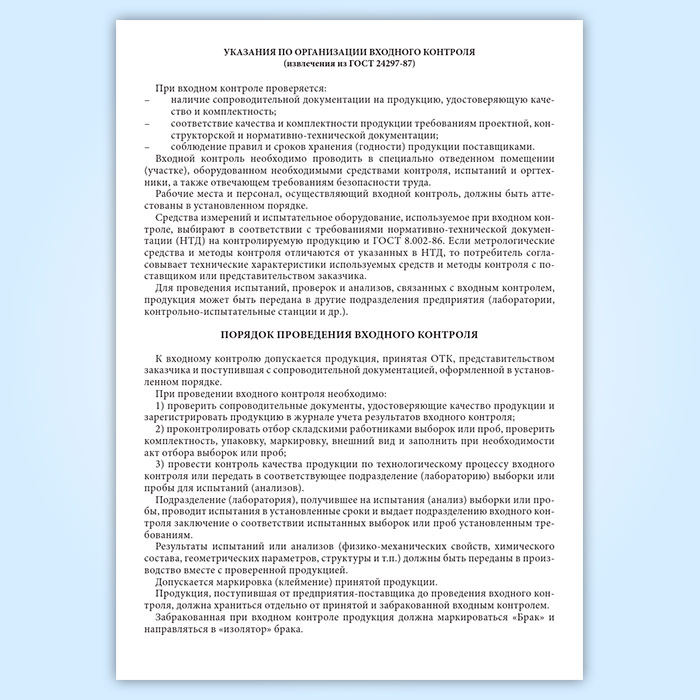 В сопроводительных документах на продукцию делают отметку о проведении входного контроля и его результатах, маркируют продукцию, если это предусмотрено перечнем продукции, подлежащей входному контролю.