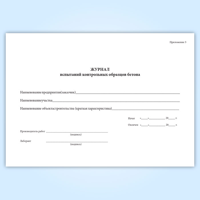 Форма журнала испытаний контрольных образцов бетона соответствует Приложению 3 к инструкции, утвержденной Минмонтажспецстроем СССР «ВСН 430-82. Инструкция по возведению монолитных железобетонных труб и башенных градирен» от 24.05.1982 года.