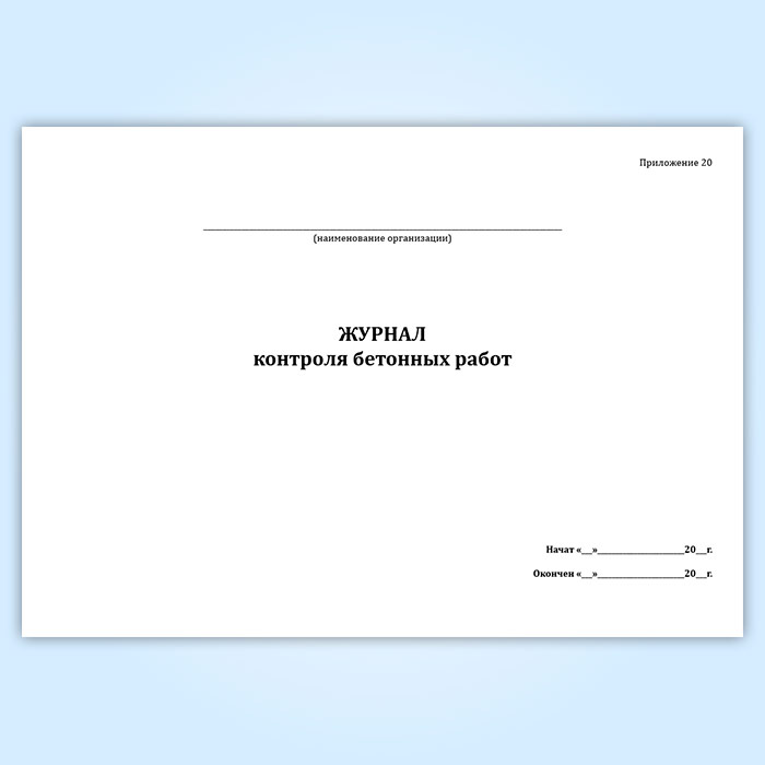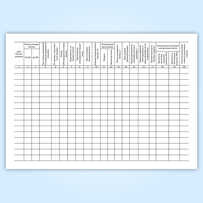 Форма журнала контроля бетонных работ соответствует Приложению №20 к ВСН 48-93 Правила возведения монолитных бетонных и железобетонных обделок для транспортных тоннелей