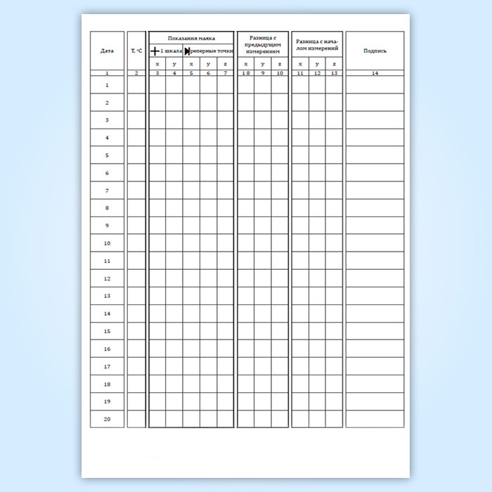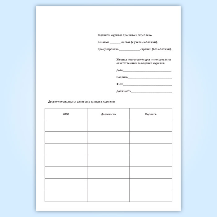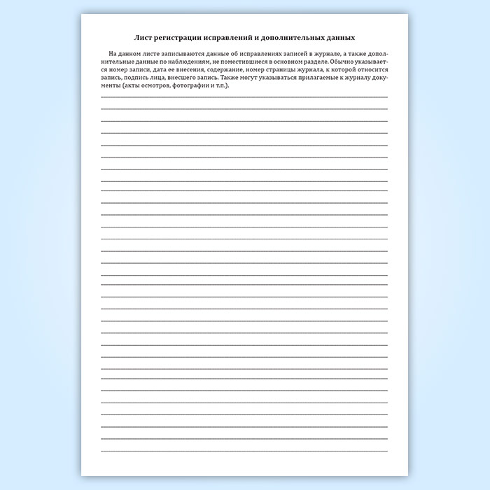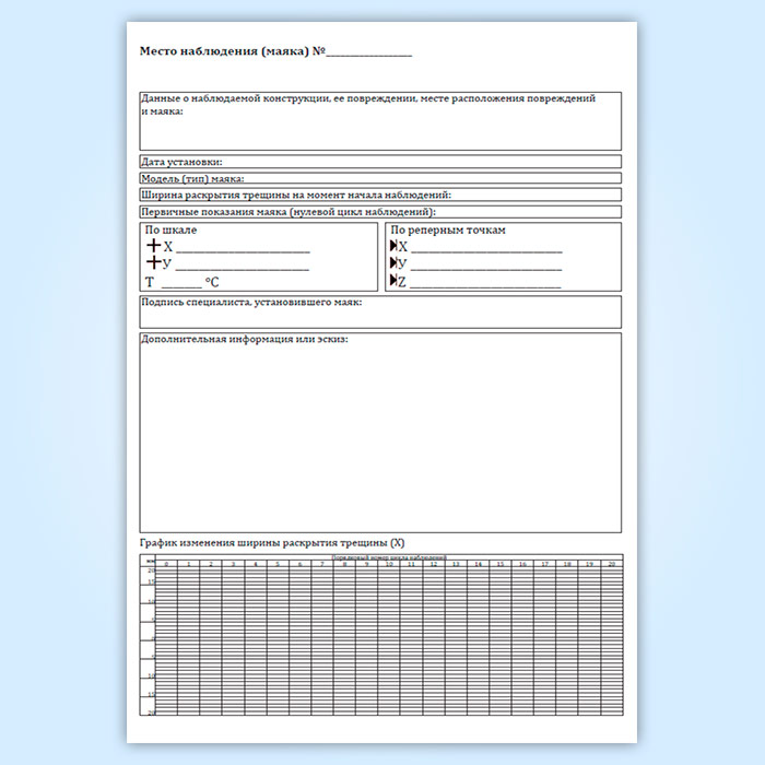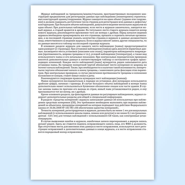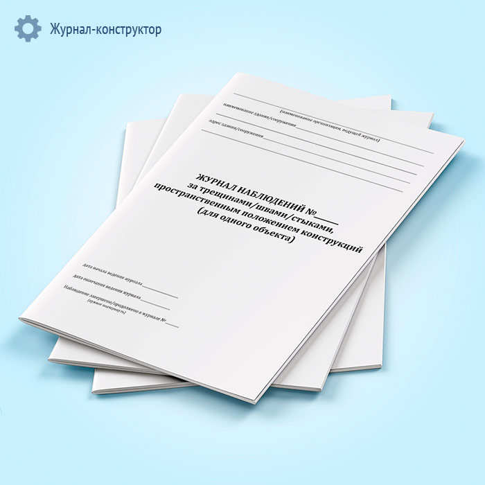 Журнал наблюдений за трещинами/швами/стыками, пространственным положением конструкций предназначен для регистрации данных при наблюдениях (мониторинге) строительных конструкций здания/сооружения. Журнал заводится на один объект (здание или сооружение) и должен содержать достаточное число страниц для регистрации всех данных о дефектах/конструкциях. При большом объеме наблюдений, допускается ведение нескольких журналов на один объект. При длительных наблюдениях, если место в журнале закончилось, заводится новый журнал, а старый хранится в архиве. На титульном листе старого журнала пишется номер нового журнала, рекомендуется присвоение того же номера с дробью. Перед началом ведения журнала необходимо пронумеровать все его страницы, прошить и скрепить печатью организации, а на последней странице указать количество страниц в журнале и данные должностного лица, ответственного за ведение журнала. Если в журнал вносят запись другие специалисты, то их данные вносятся в таблицу на последней странице журнала.