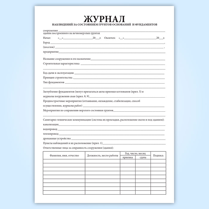 Журнал наблюдений за состоянием грунтов оснований и фундаментов соответствует Приложению 11 к "Рекомендациям по наблюдению за состоянием грунтов оснований и фундаментов зданий и сооружений, возводимых на вечномерзлых грунтах".