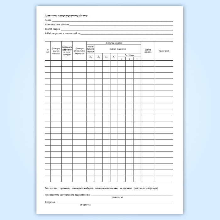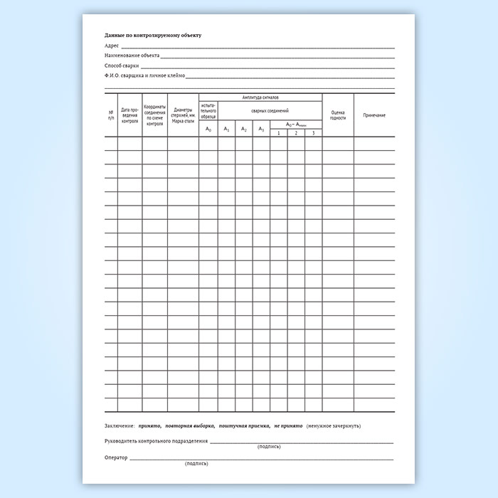Журналы должны храниться на предприятии, проводящем контроль в соответствии с установленным порядком. Заключение (протокол) является неотъемлемой частью акта скрытых работ, которые могут составляться как на одну, так и на несколько групп сварных соединений контролируемого объекта или узла. Журнал и копии протоколов результатов ультразвуковой дефектоскопии относится к документации, рекомендуемой для фиксирования результатов контроля при производстве сварочных и контрольных работ.