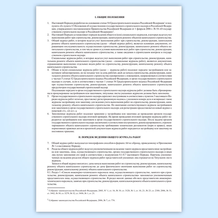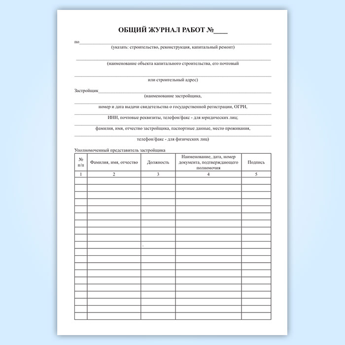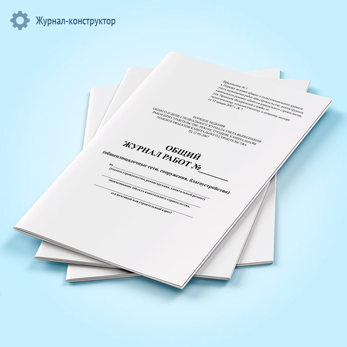 Форма общего журнала работ (общеплощадочные сети, сооружения, благоустройство) соответствует приложению № 1 к Порядку ведения общего и (или) специального журнала учета выполнения работ при строительстве, реконструкции, капитальном ремонте объектов капитального строительства, утв. приказом Федеральной службы по экологическому, технологическому и атомному надзору от 12 января 2007 г. №7
