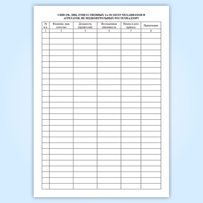 Раздел "Список лиц, ответственных за осмотр механизмов и агрегатов, не подконтрольных Ростехнадзору" имеет графы: