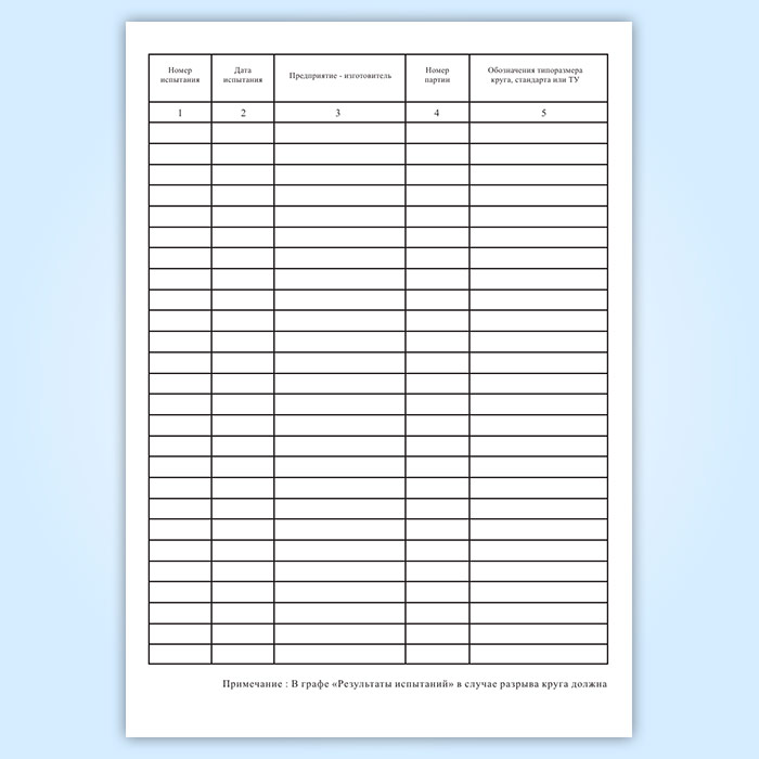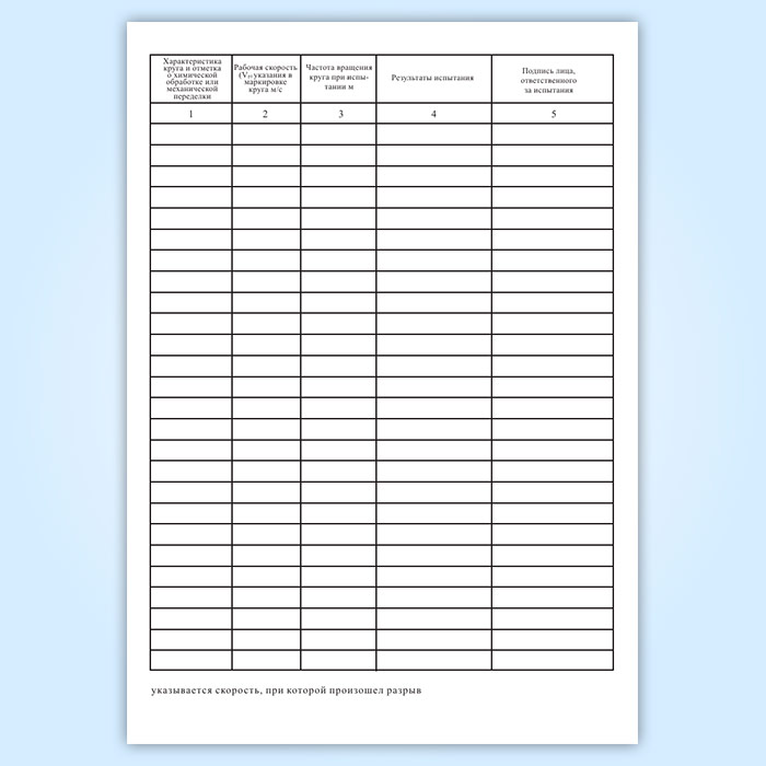 Результаты испытания кругов должны записываться в журнал, прошнурованный и скрепленный сургучной печатью. Страницы журнала должны быть пронумерованы.