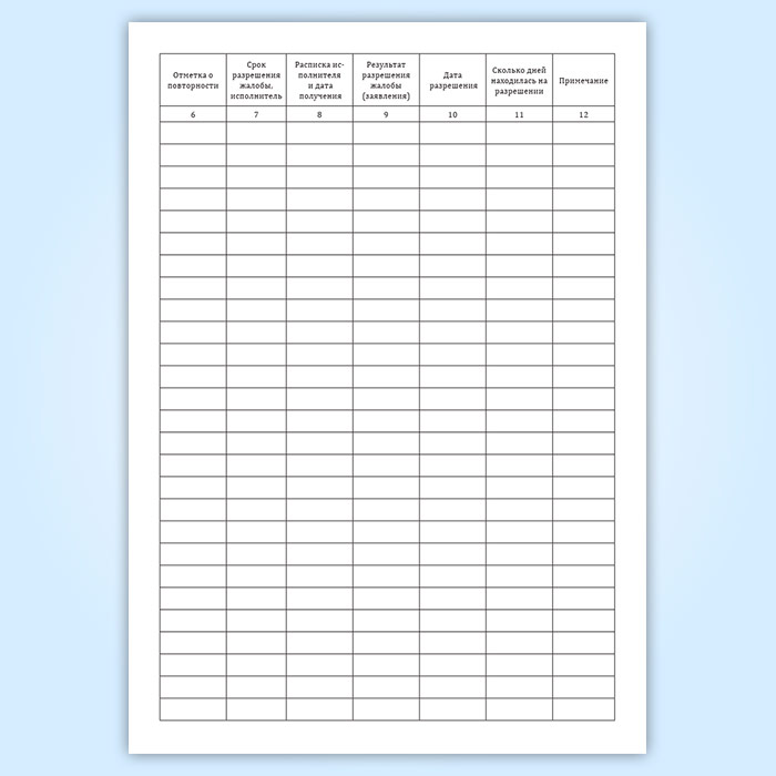 Форма журнала регистрации предложений, заявлений и жалоб на работу суда, не подлежащих рассмотрению в порядке, установленном уголовно-процессуальным и гражданско-процессуальным законодательством соответствует Приложению к Инструкции по судебному делопроизводству в районном суде
