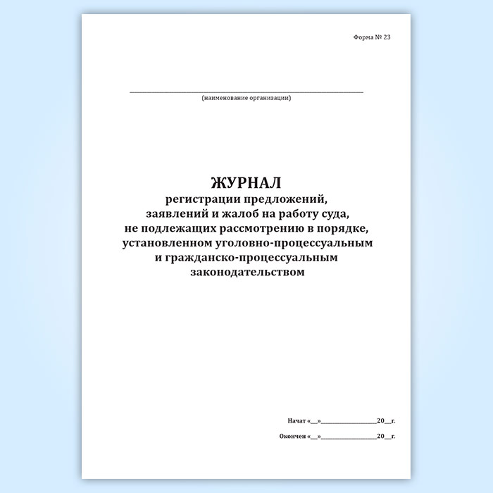 Журнал регистрации предложений, заявлений и жалоб на работу суда, не подлежащих рассмотрению в порядке, установленном уголовно-процессуальным и гражданско-процессуальным законодательством (форма № 23)