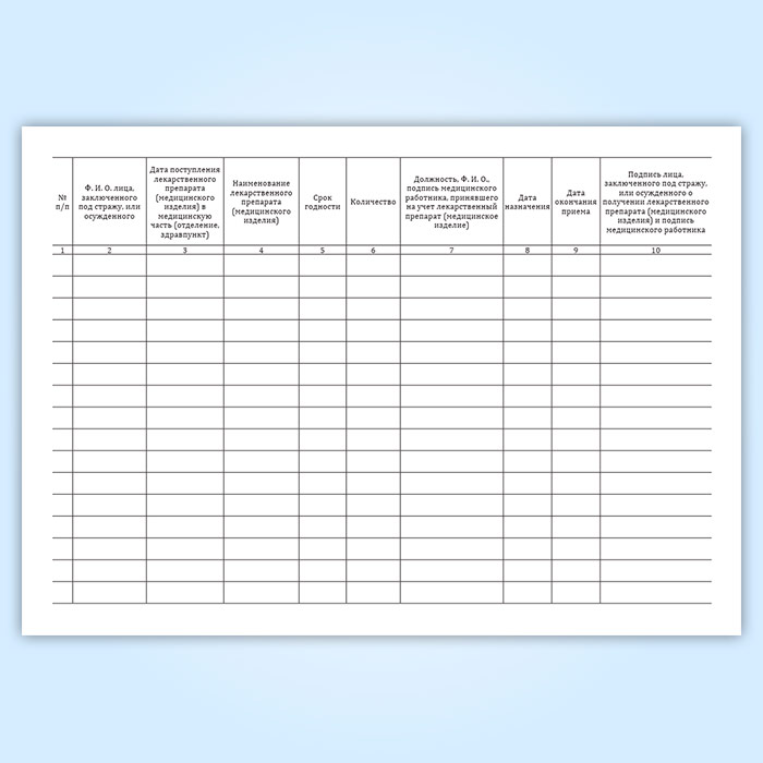 Лекарственные препараты и медицинские изделия, поступающие в передачах или посылках, в соответствии с назначением врача (фельдшера) указываются в медицинской карте пациента, получающего медицинскую помощь в амбулаторных условиях, или медицинской карте стационарного больного и в журнале учета лекарственных препаратов и медицинских изделий, поступающих в передачах или посылках. По окончании курса лечения в журнале учета лекарственных препаратов и медицинских изделий, поступающих в передачах или посылках, делается запись о получении препарата, заверенная подписями медицинского работника и лица, заключенного под стражу, или осужденного.