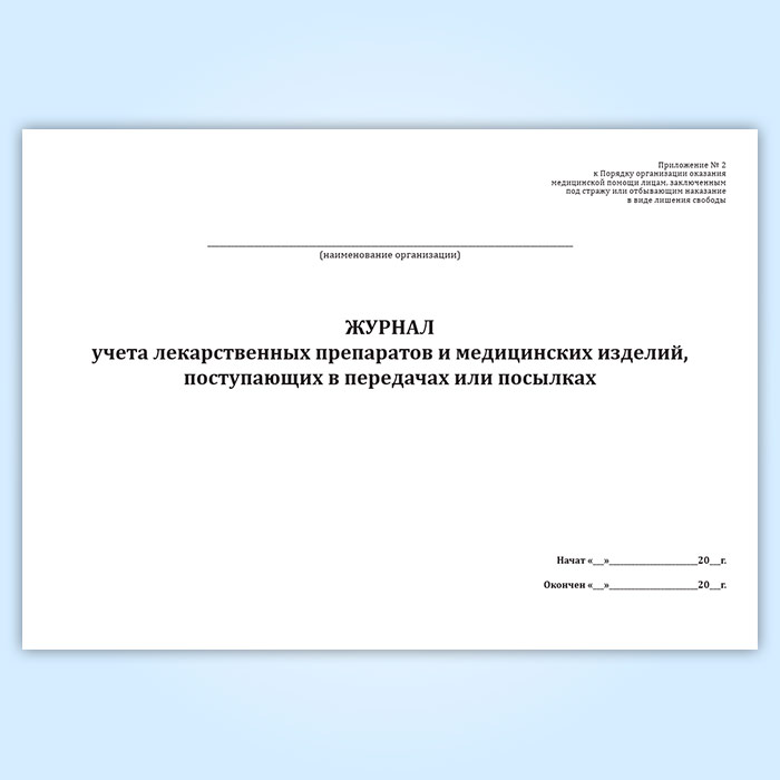 Форма журнала учета лекарственных препаратов и медицинских изделий, поступающих в передачах или посылках соответствует Приложению №2 к Приказу Минюста России от 28.12.2017 N 285 " Об утверждении Порядка организации оказания медицинской помощи лицам, заключенным под стражу или отбывающим наказание в виде лишения свободы"